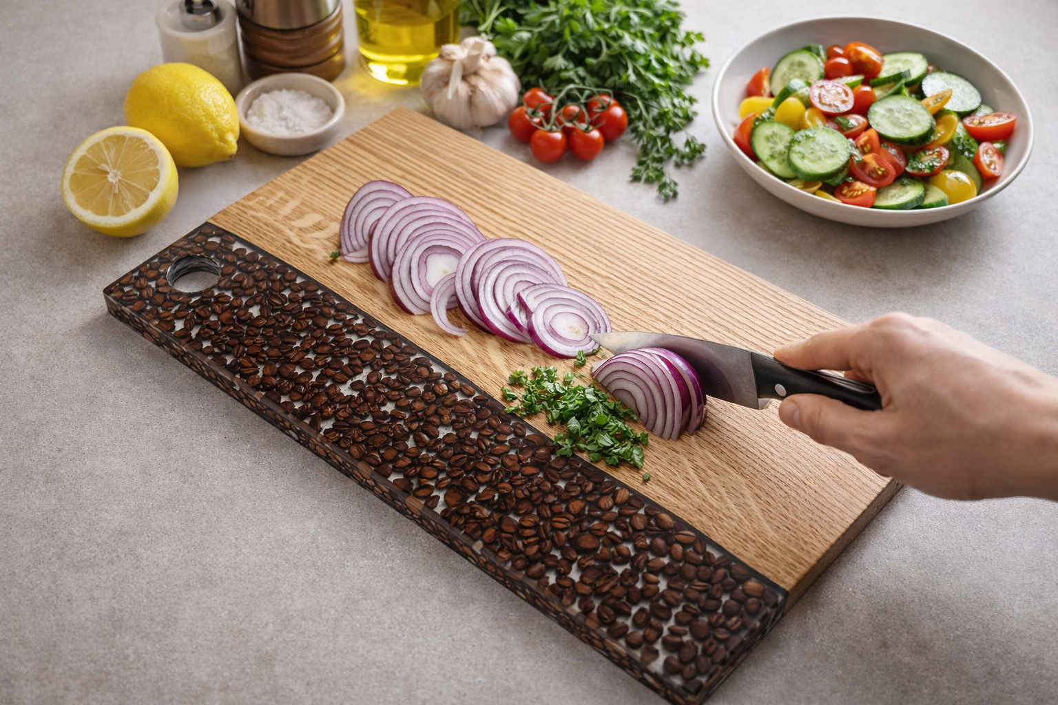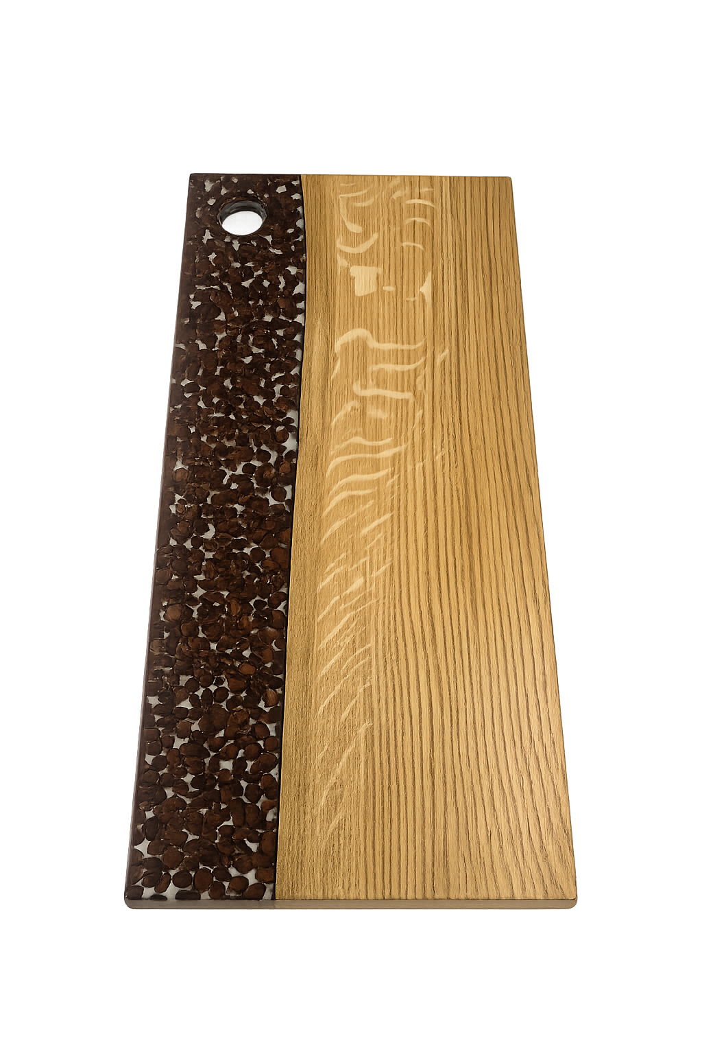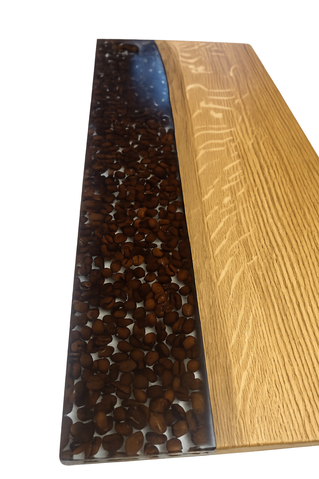 Kahvin ystäville täydellinen leikkuulauta koristamaan kotiasi. Laudan puuosa on kestävää tammea ja kirkas osa epoksihartsia jonka sisään on valu vaiheessa upotettu oikeita kahvipapuja. Lauta on käsitelty Vinnie's oil elintarviketurvallisella öljyllä. Vinnie's oil on monen väittämän mukaan paras öljy leikkuulautoihin sillä se imeytyy syvälle puunsyihin tehden pinnasta kestävän ja vettä hylkivän.