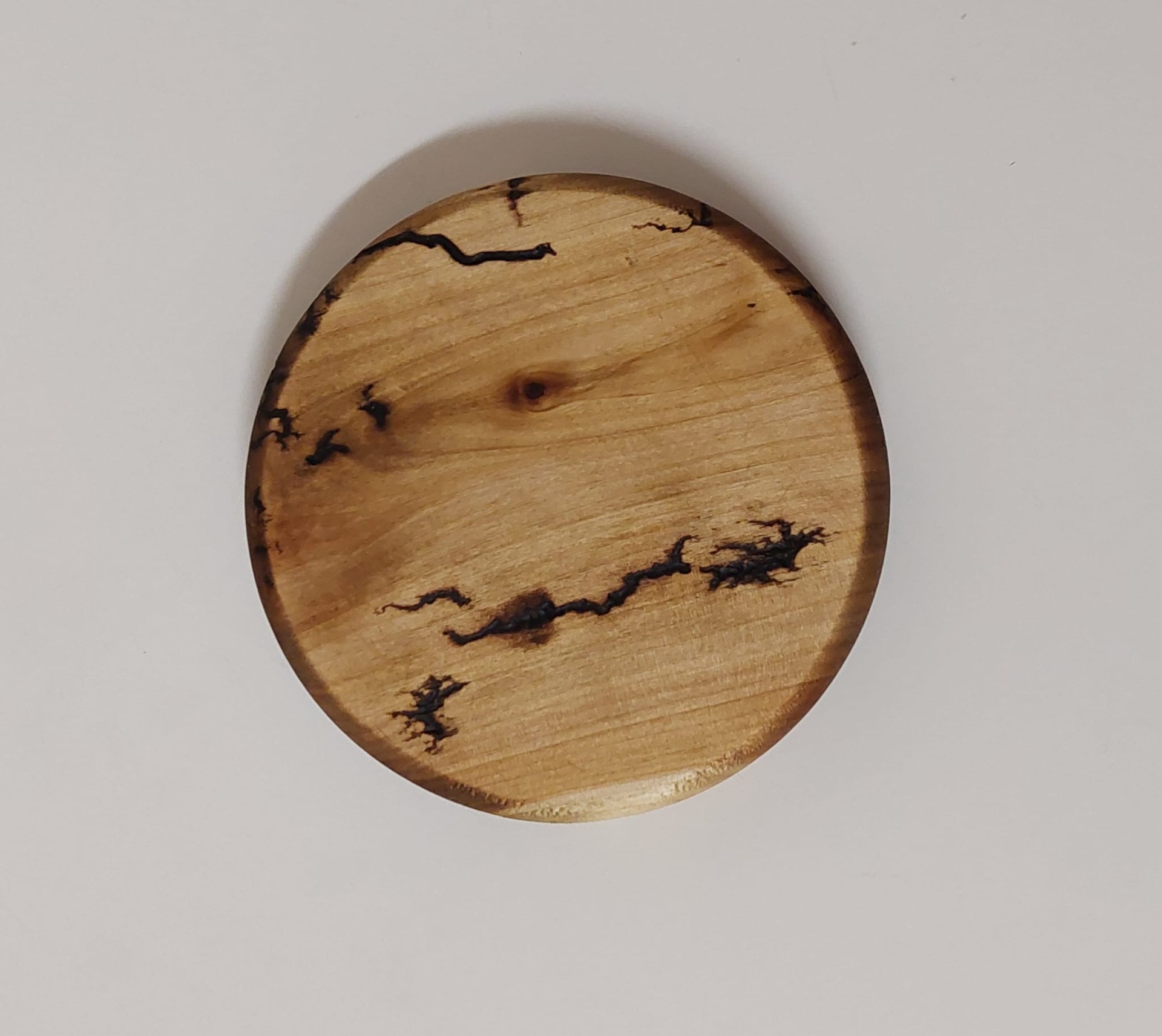 Puun luonnollista halkeilua ja muotoa kunnioittava pyöreä pannunalunen, jota korostettu fraktaali-poltolla. Materiaali: Pellavaöljyllä käsitelty Leppä.
