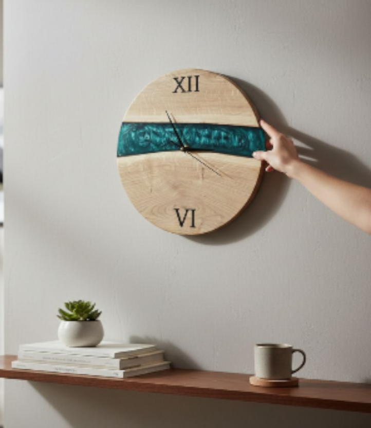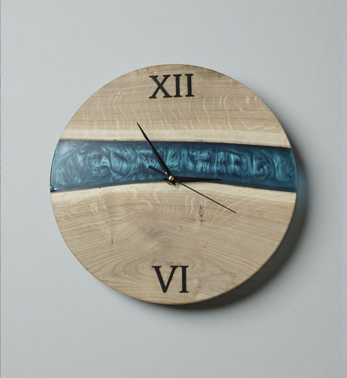 Tammesta ja epoksihartsista tehty upea Joki-kello.