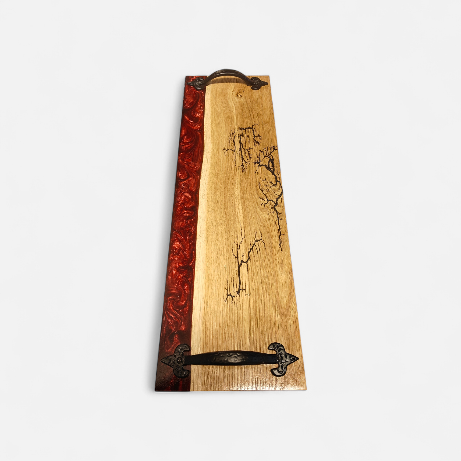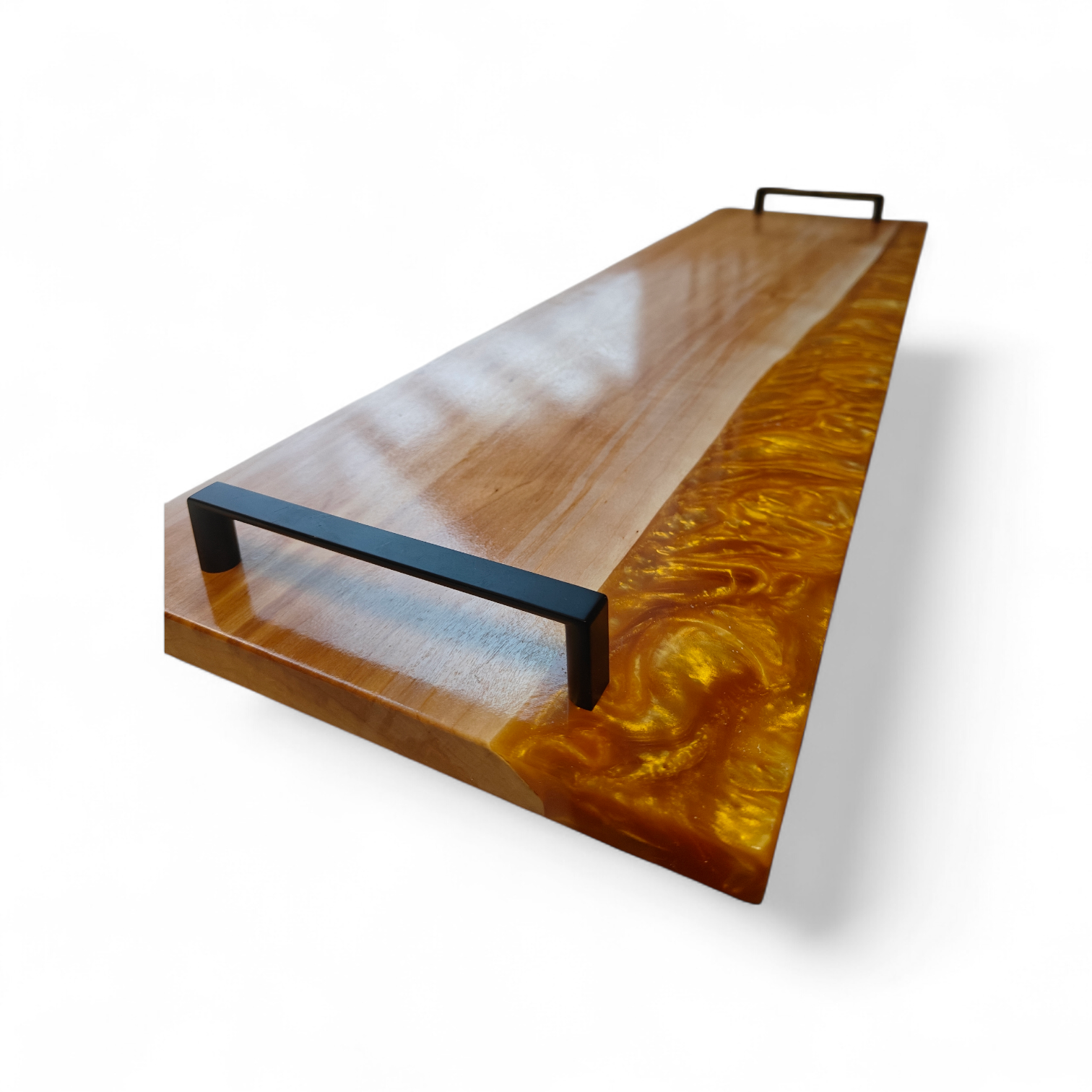 Tämä tarjottimien kuningas jättää kylmäksi kilpakumppaninsa. Ylellisen kultaisen värinsä ja massiivisen kokonsa ansiosta, tämä on kuin luotu koristamaan keittiötä ja tuomaan tarjoilut tyylillä pöytään. Materiaali: Leppä + epoksihartsi Pintakäsittely: Vesiohenteinen 2-komponenttilakka. Erittäin kova kulutuskestävyys.